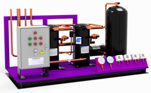 Агрегаты компрессорно-ресиверные на базе спиральных компрессоров COPELAND Стандартная комплектация агрегата: - Герметичный компрессор (запорные вентили на всасывании и нагнетании, картерный нагреватель), система охлаждения впрыском жидкого хладагента (для низкотемпературных компрессоров). - Жидкостной ресивер с запорным вентилем на входе и выходе. - Жидкостная линия (фильтр-осушитель, смотровое стекло). - Всасывающая линия (фильтр-очиститель). - Прессостаты высокого и низкого давления. - Пылевлагозащищенный шкаф управления агрегатом и конденсатором. - Документация (паспорт, руководство по эксплуатации, схемы электрических подключений).